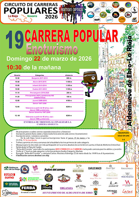 Decimonovena edición de la Carrera Popular Enoturismo que se celebrará el próximo 22 de marzo, en Aldeanueva de Ebro, organizada por el Ayuntamiento de Aldeanueva de Ebro con la colaboración del Club Atletismo Entreviñas.
