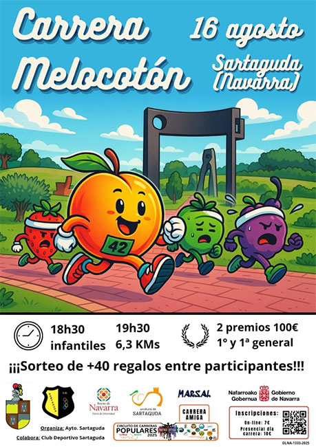 Como previo a la Feria del Melocotón de Sartaguda (Navarra), el Ayuntamiento de la localidad navarra, junto al Club Deportivo Sartaguda, organiza la octava edición de la «Carrera del melocotón» el sábado, 16 de agosto, con dos categorías, una infantil y otra absoluta de 6,3 kilómetros.