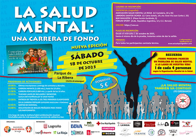 La la Asociación Salud Mental La Rioja, organiza la décima edición de la ‘La Salud Mental: Una carrera de fondo’, prueba que tendrá lugar el sábado 18 de octubre en Logroño.