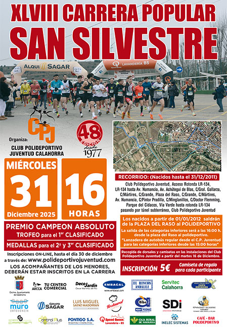 El Club Polideportivo Juventud organiza la Carrera Popular San Silvestre de Calahorra, que este año año cumple la cuadragésimo octava edición. La prueba se celebrará el martes, 31 de diciembre, a partir de las 16:00 horas.