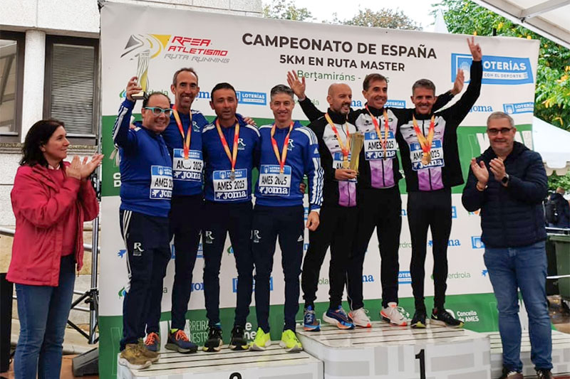 El atletismo riojano ha vuelto a demostrar hoy que es una potencia en categoría Master. Tras las 6 medallas conseguidas en el Campeonato de Europa Máster de Atletismo que se ha celebrado hasta hoy en Madeira, los riojanos han sumado este domingo otras siete preseas (cinco oros y dos platas) en la cuarta edición del Campeonato de España de 5 km en Ruta, celebrado en la localidad coruñesa de Bertamiráns bajo una incesante lluvia.